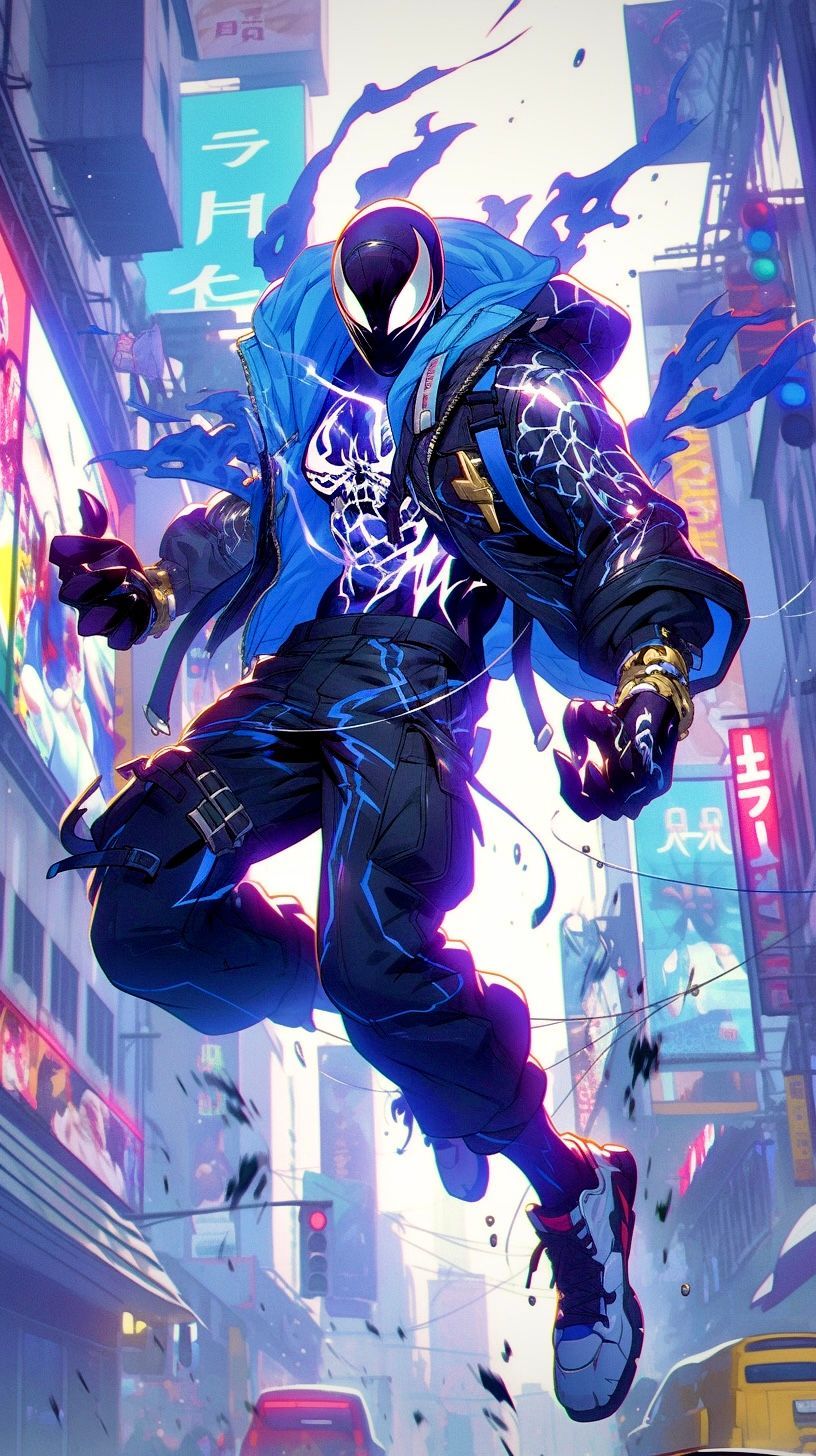 Venom from the cinematic venom and carnage movies, flying in the air with his iconic venom spider icon on his chest, in a super villain venom pose, in the style of the marvel cinematic universe, neon blue and vibrant purple, flying through a cyber punk city, sunlight glow, realistic rendering, unreal engine 5 --ar 9:16 --stylize 1000 --c 30 --niji 5